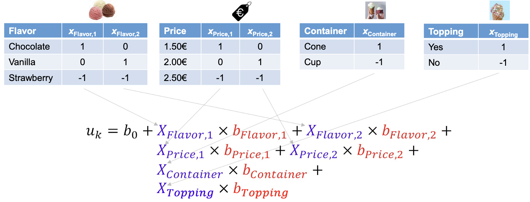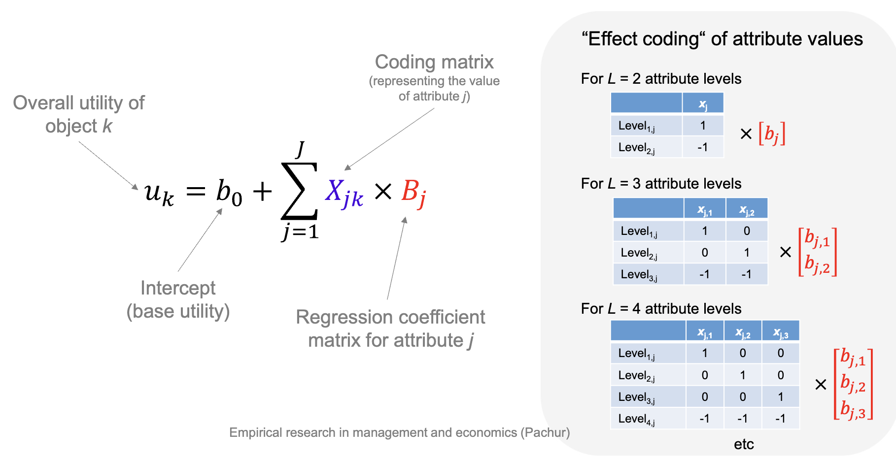 The latent utility for profile is modeled as a function of the attribute levels and their corresponding coefficients (part-worth utilities) . The intercept represents the baseline utility.