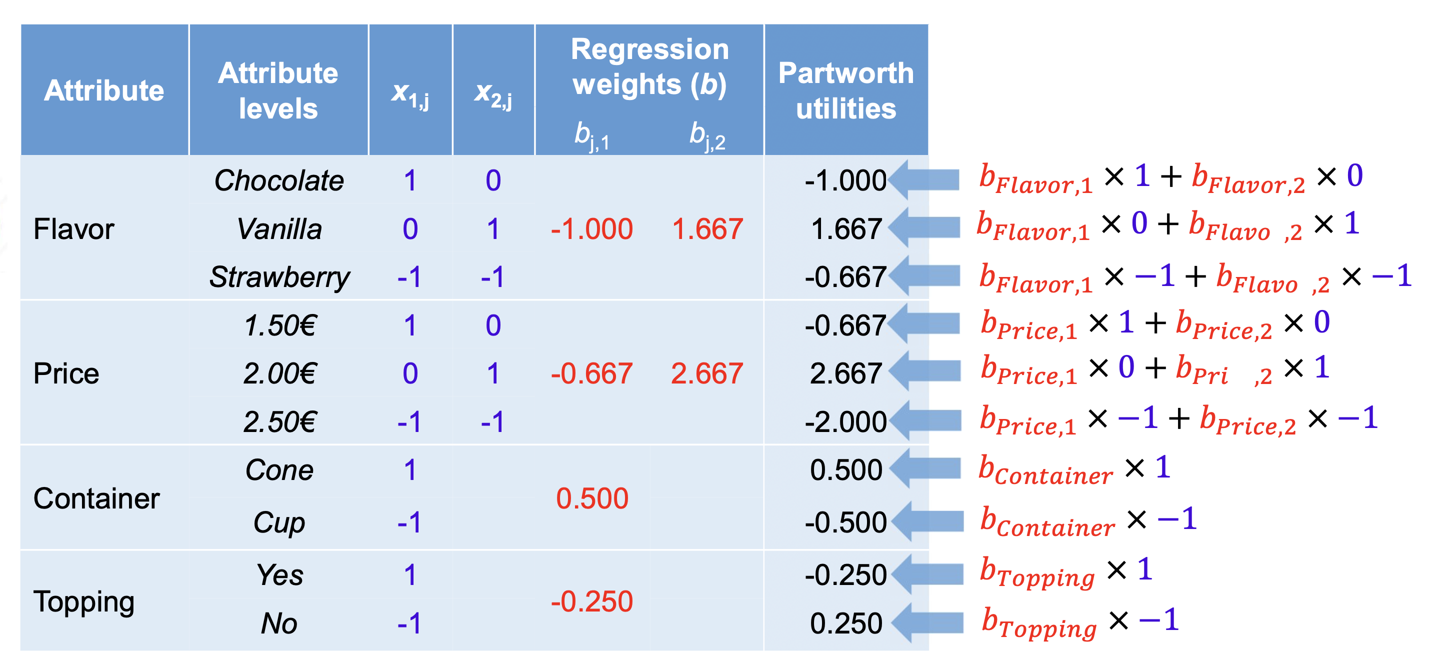 Partworth utilites are calculated by multiplying the respective regression coefficient matrix row with the attribute level coding.