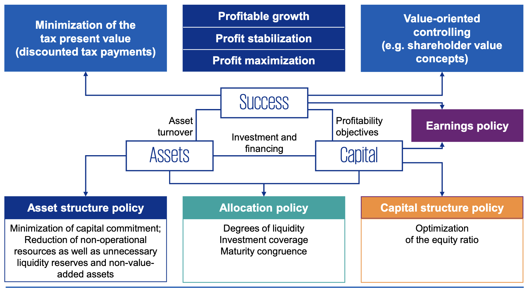 | Return on Equity (RoE) | How much income is earned for shareholders on invested capital. Target must be capital market interest rate + industry-dependent risk premium, often 5–10%. Given constant profits, lower equity used is better (leverage effect) | |
