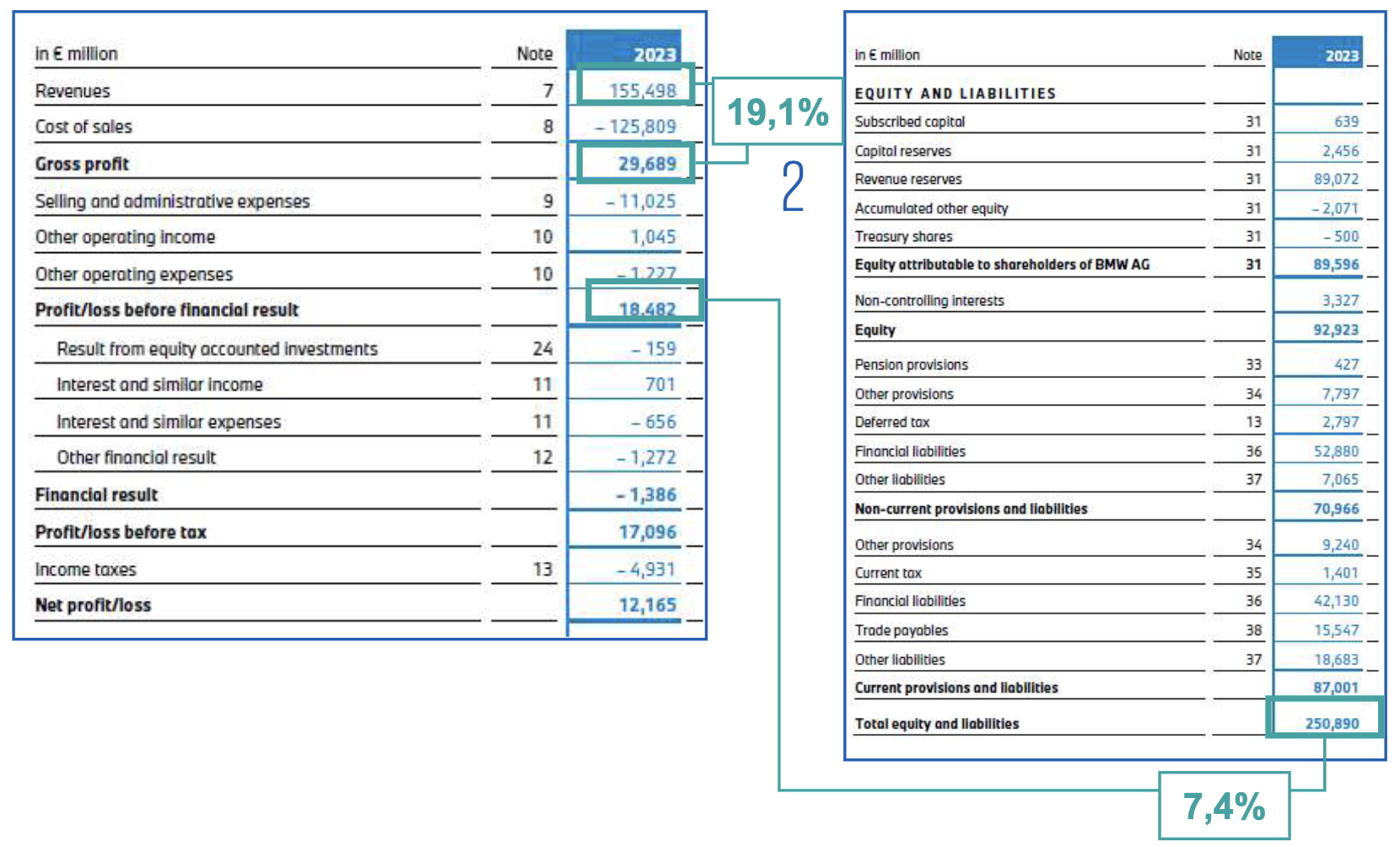 Examples: Profit before financial result / Total equity and liabilities, Gross profit / Revenues