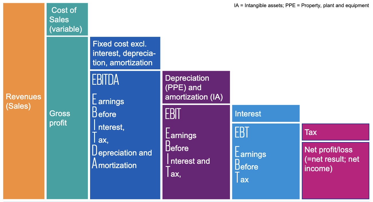 Gross Profit - Fixed Costs (exl. interest, deprecation, amortization)Earnings Before Interest, Taxes, Depreciation, and Amortization. A proxy for operating cash flow. - EBIT: