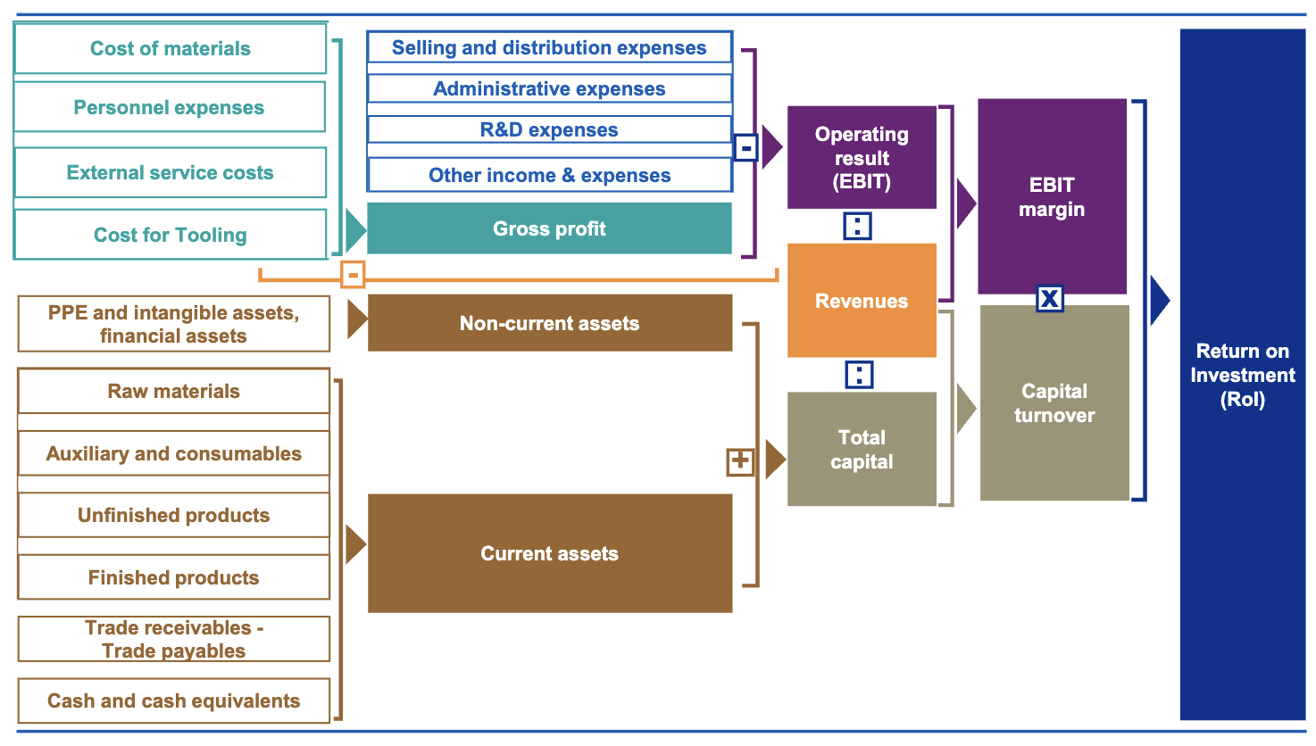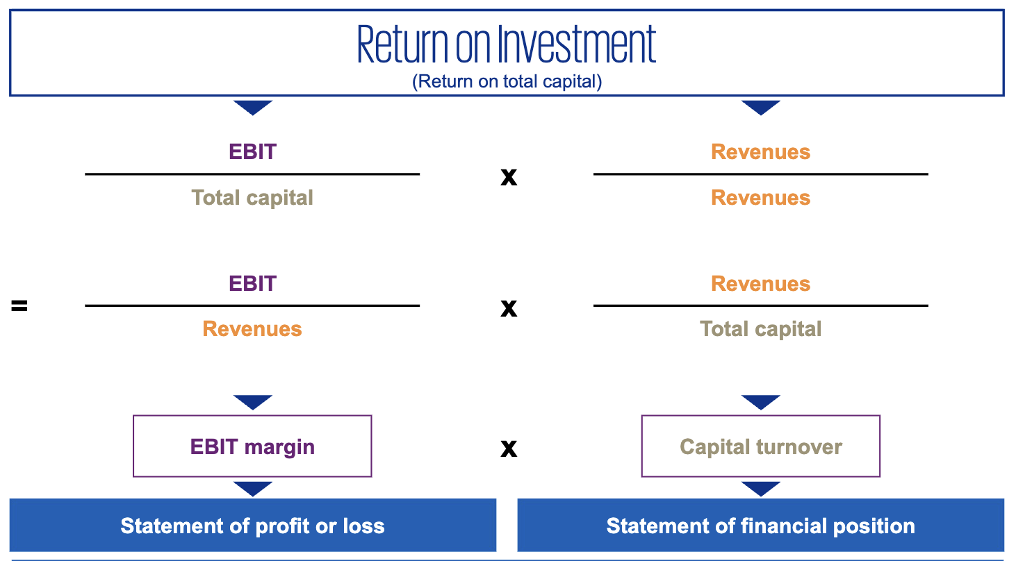 These breakdowns show that returns are driven by both profitability (margins) and efficiency (turnover). A company can improve its RoE/RoI by increasing its margins, using its assets more efficiently to generate sales, or a combination of both.
