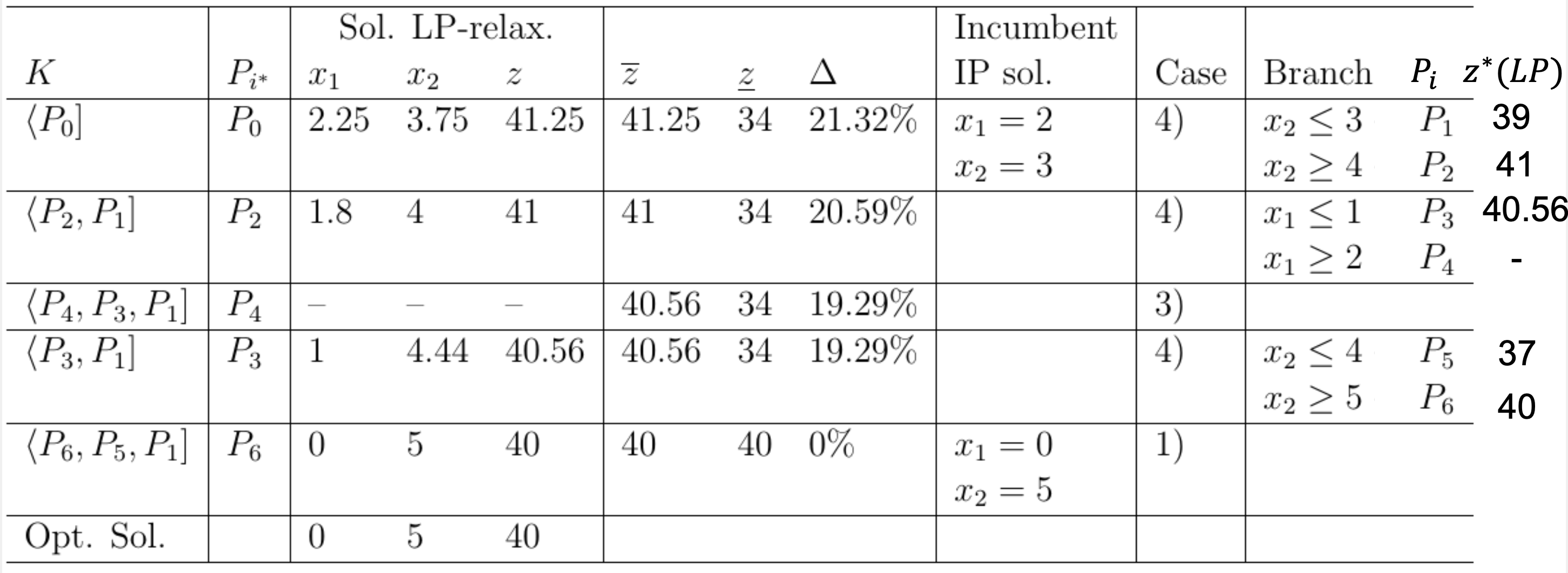 The branch and bound process can be organized in a table format, tracking each subproblem’s details. The columns typically include: