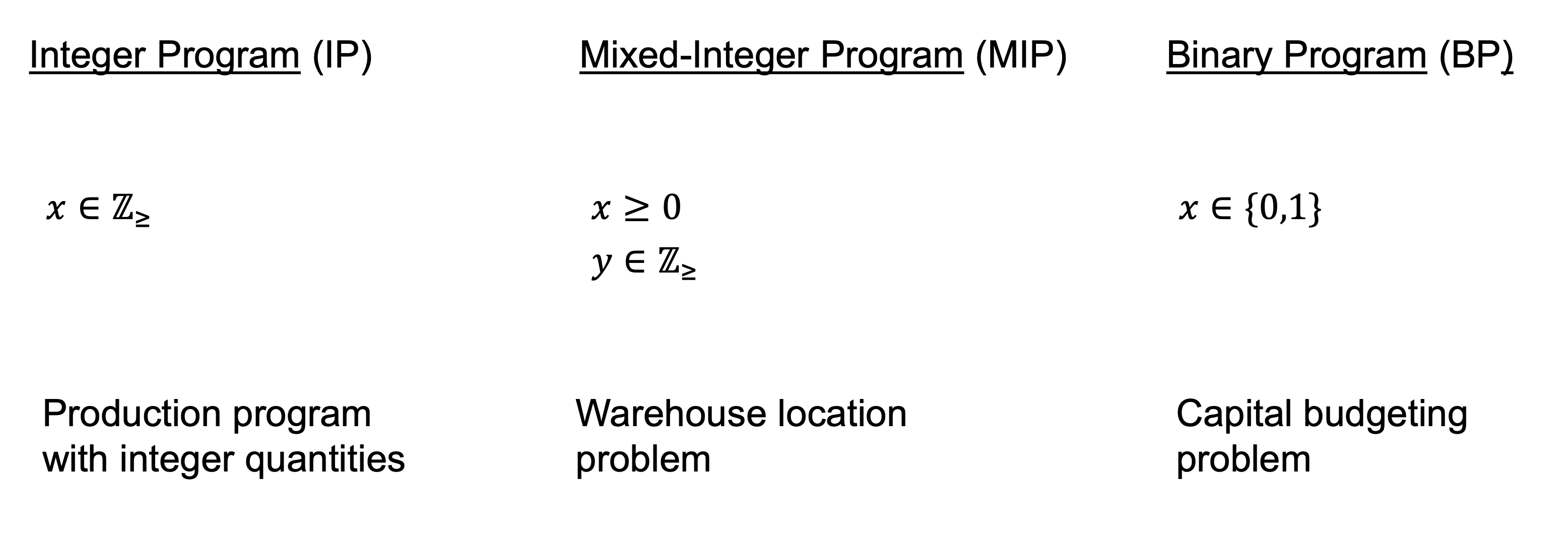 Mixed-integer programs were briefly demonstrated in the lecture using the warehouse location problem but not discussed further.