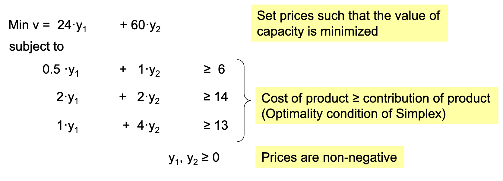 The dual’s objective function is a minimization of each constraint’s capacity (right-hand side) multiplied by its shadow price (dual variable).