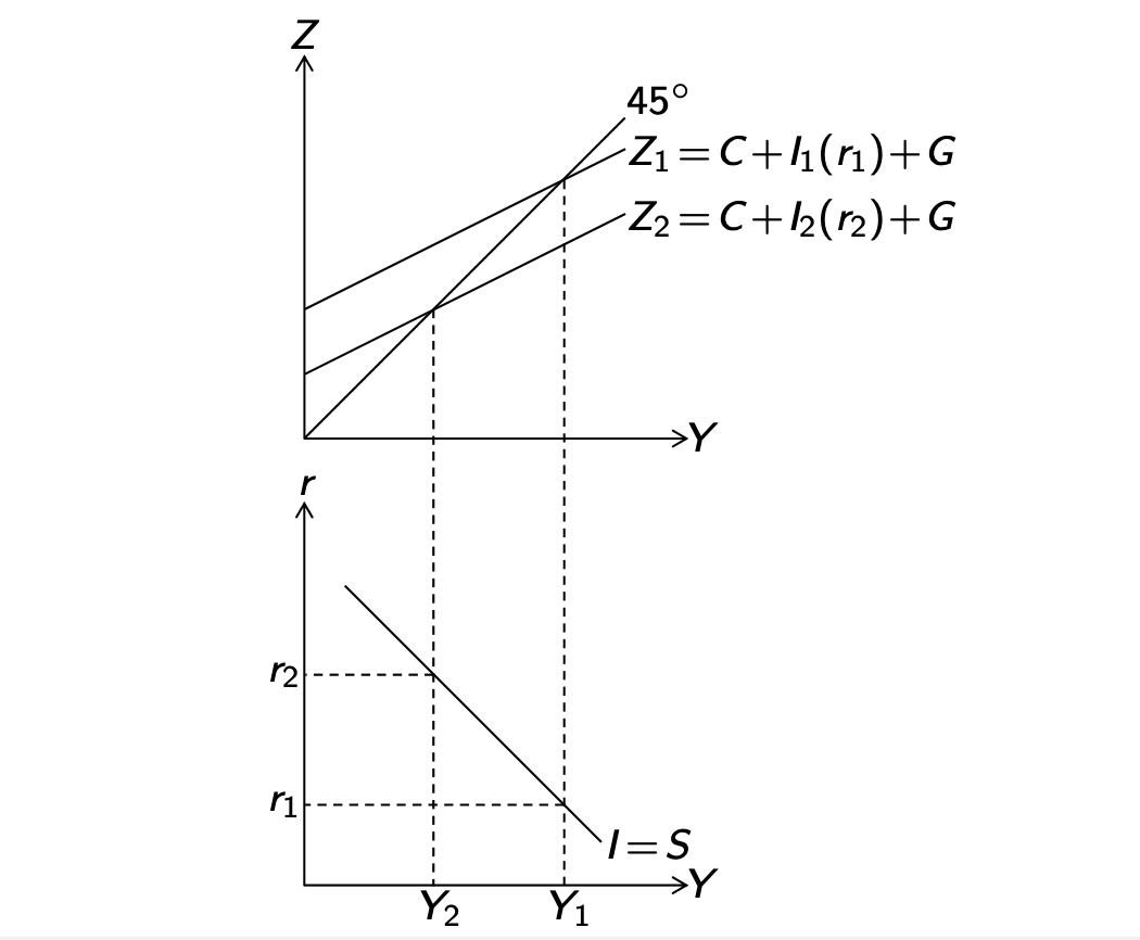 The second part is planned investment, which depends negatively on the interest rate and decreases with higher . Lastly, government spending is exogenous (not influenced by the model).