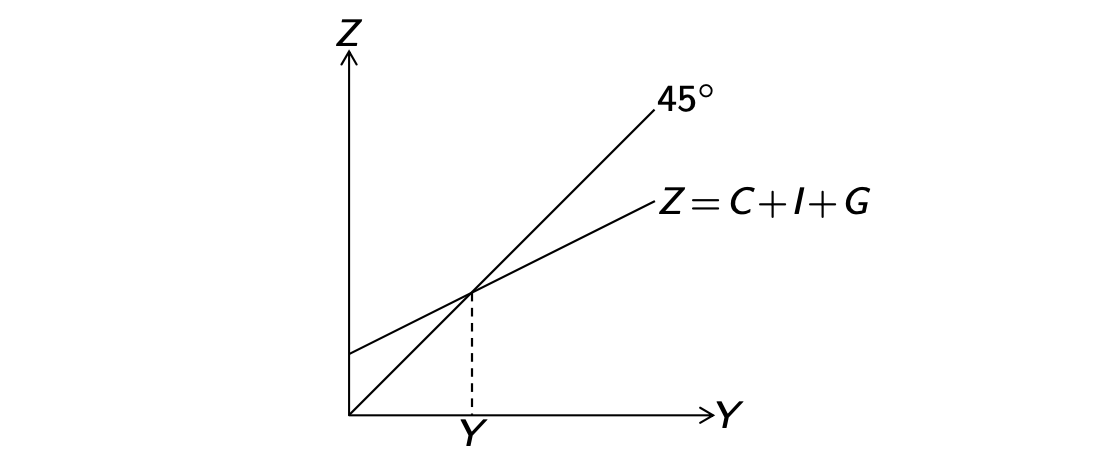 With , this is the point where the demand line intersects with the 45-degree line in the Keynesian cross diagram.