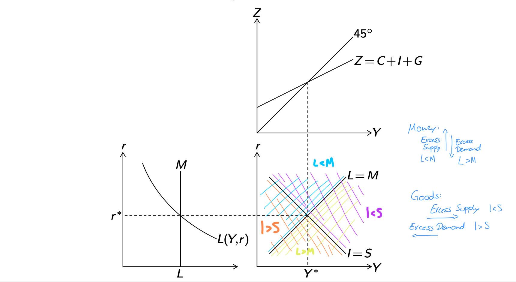 Points above the LM curve indicate excess supply in the money market, while points below indicate excess demand.