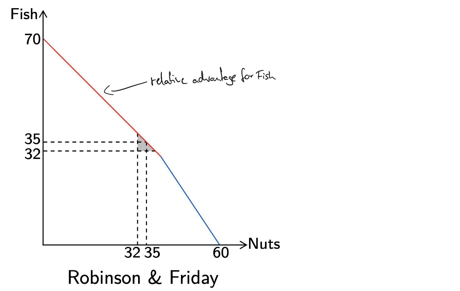 - Friday has a comparative advantage in Nuts (giving up 1 Fish is cheaper than Robinson giving up 3/2 Fish).